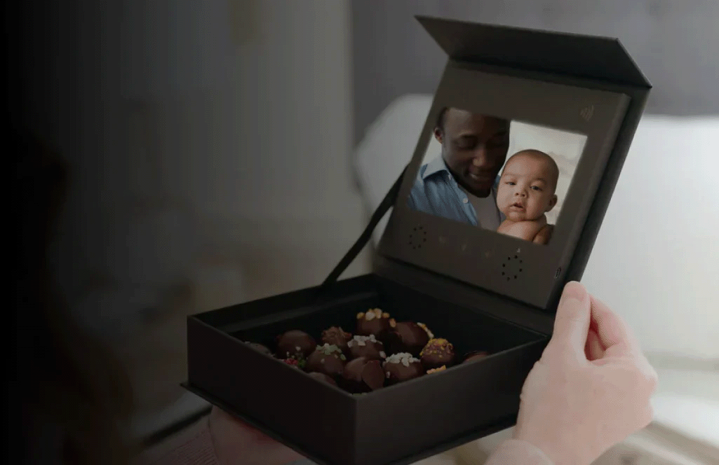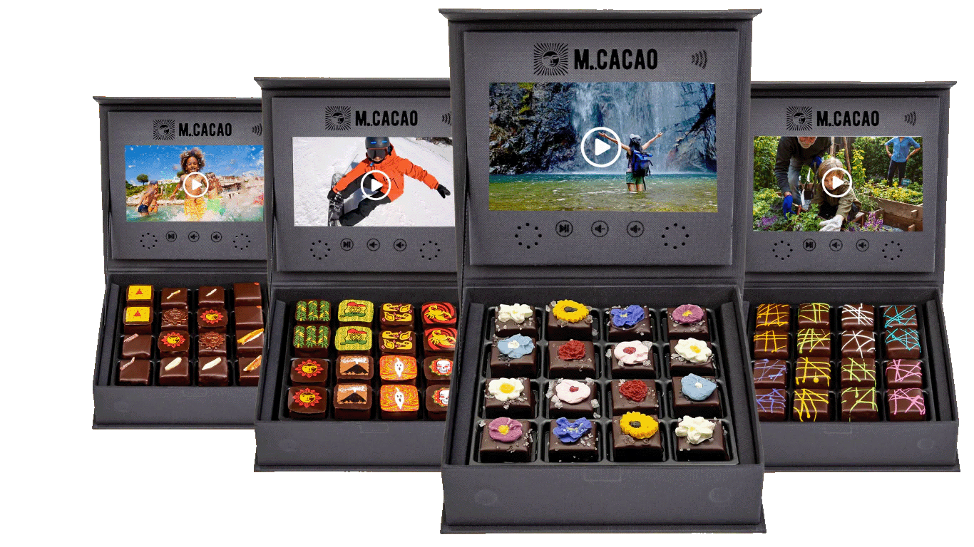 With the Expressio custom chocolate box, upload your personal video or photo slideshow to our digital screen, nestled among French chocolate delicacies. Your memories play in brilliant HD while they savor each bite.